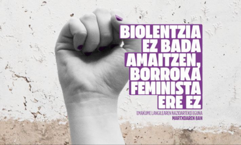 Egun guztiek martxoaren 8a izan beharko lukete, emakumeen aurkako indarkeria amaitzen ez den bitartean; aurten, inoiz baino gehiago, mundu osoko emakumeen eguneroko borroka nabarmendu eta ikusarazi nahi dugu, «indarkeriarik gabeko eta bakean» mundu bat lortzeko, non pertsona guztiok erabat garatu ahal izango garen.