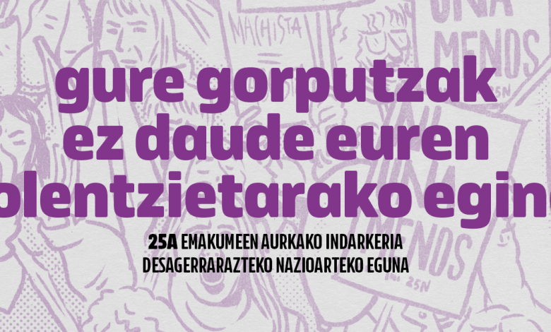 Azaroaren 25ean, indarkeria matxista guztien aurkako kaleetara itzuliko gara, eta oihukatuko dugu gure gorputzak ez daudela beren indarkerietarako eginak