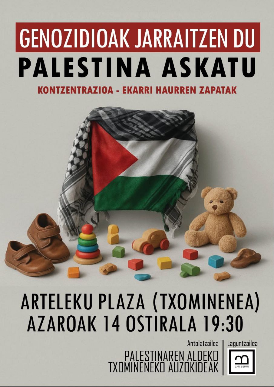 Genozidioa ez da gelditu. Hori dela eta, azaroaren 14an elkarretaratzea egingo da 19:30ean Arteleku plazan (Txominenea). Bertan, haurren zapatak jasoko dira palestinarrei bidaltzeko.