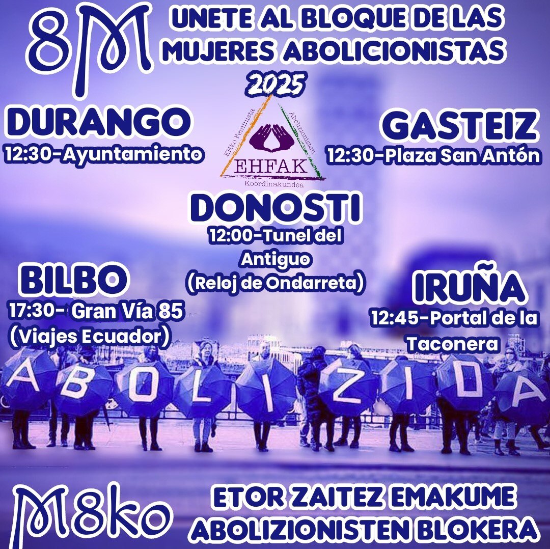 Larunbatean, 2025eko martxoaren 8an, Emakumeen Nazioarteko Eguna ospatuko da. Mugimendu feministak honako manifestazio hauek deitu ditu hiru euskal hiriburuetan: