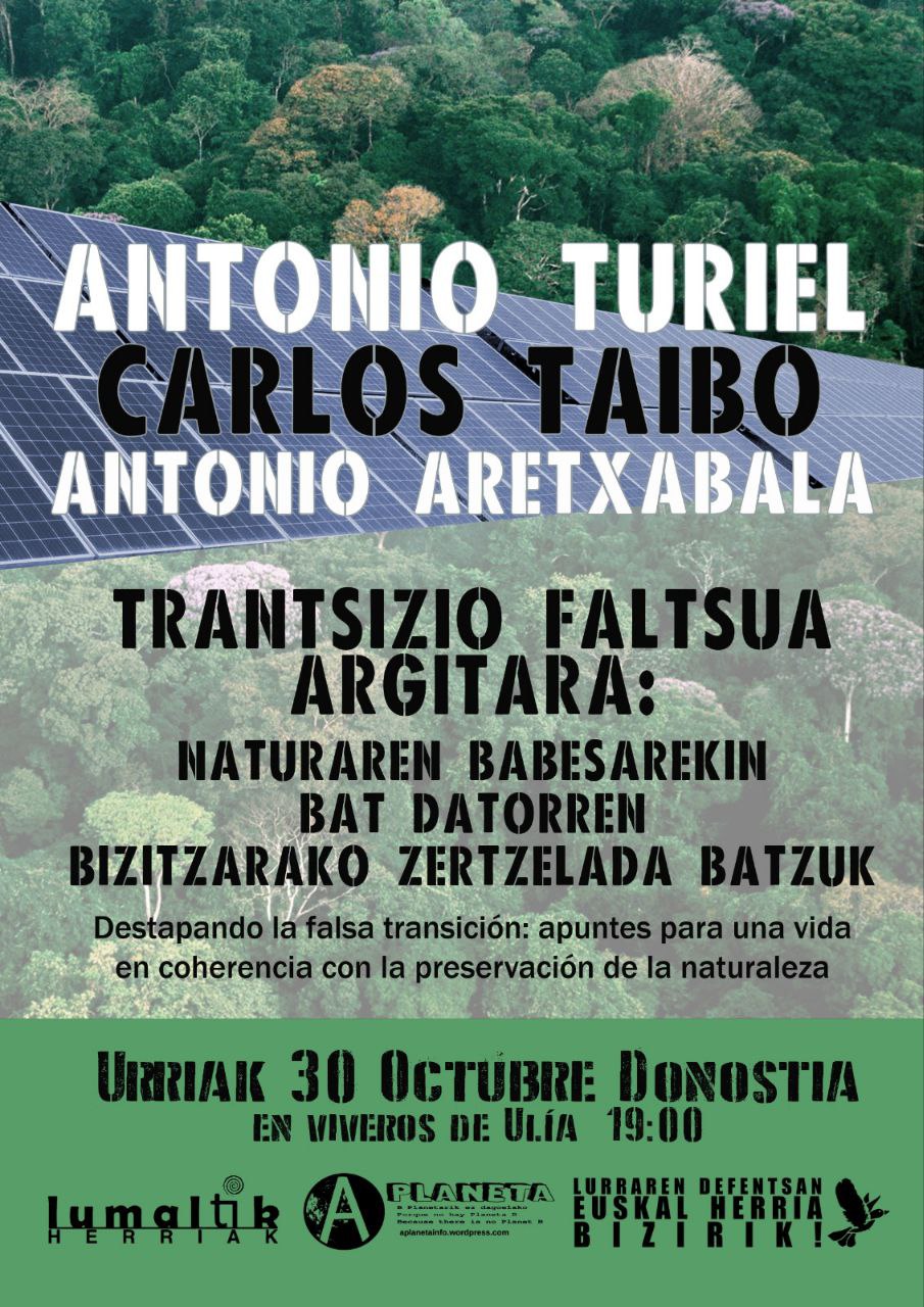 Antonio Turiel, Carlos Taibo y Antonio Aretxabala participarán en una charla para destapar la falsa transición: apuntes para una vida en coherencia con al preservación de la naturaleza. 30 de octubre en Viveros de Ulía (Donostia) a las 19:00 horas.