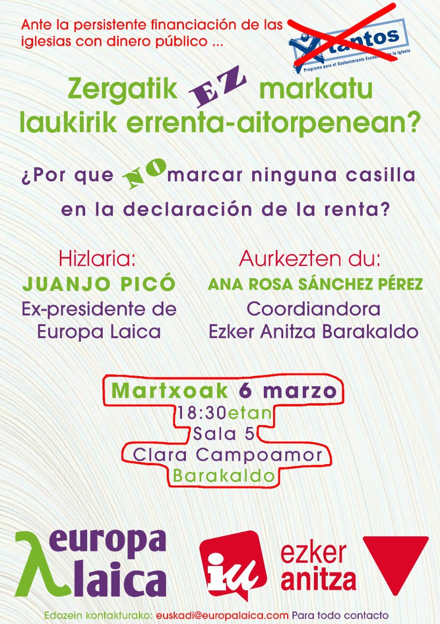 El próximo 6 de marzo a las 18:30 horas Ezker Anitza-IU y Europa Laica han organizado en el Centro Cultural Clara Campoamor de Barakaldo una charla en la que intervendrá el expresidente de Europa Laica, Juanjo Picó. La entrada es libre hasta completar aforo.