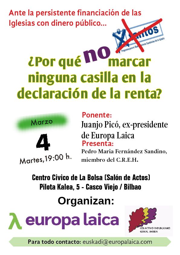 Ante la persistente financiación de las iglesias con dinero público, el 4 de marzo se ofrece una charla titulada ¿Por qué no marcar ninguna casilla en la declaración de la renta?. El ponente será Juanjo Picó, el expresidente de Europa Laica. La charla será en el Edificio de la Bolsa de Bilbao, a las 19:00 horas. La entrada será libre hasta completar aforo.