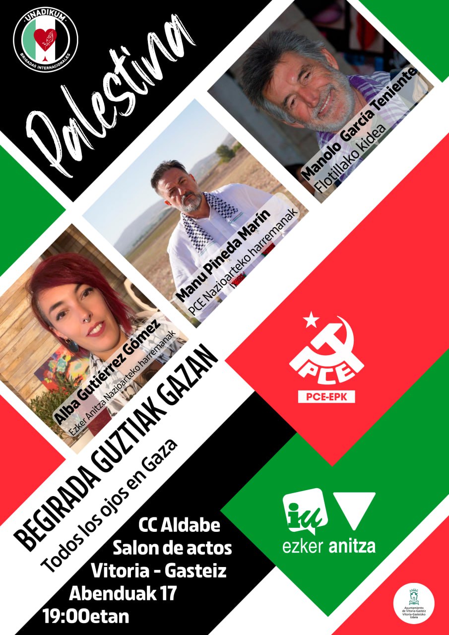 El 17 de diciembre a partir de las 19:00 horas tendrá lugar una charla sobre la situación real que vive Gaza. El encuentro contará con el testimonio directo de Manu Pineda Marín, responsable de Internacional del PCE; Alba Gutiérrez Gómez, responsable de Internacional de Ezker Anitza-IU y Manolo García Morales ‘Teniente’, miembro de la Flotilla. La charla se celebrará en el Centro Cultural Aldabe de Vitoria-Gasteiz. La entrada es libre hasta completar aforo.