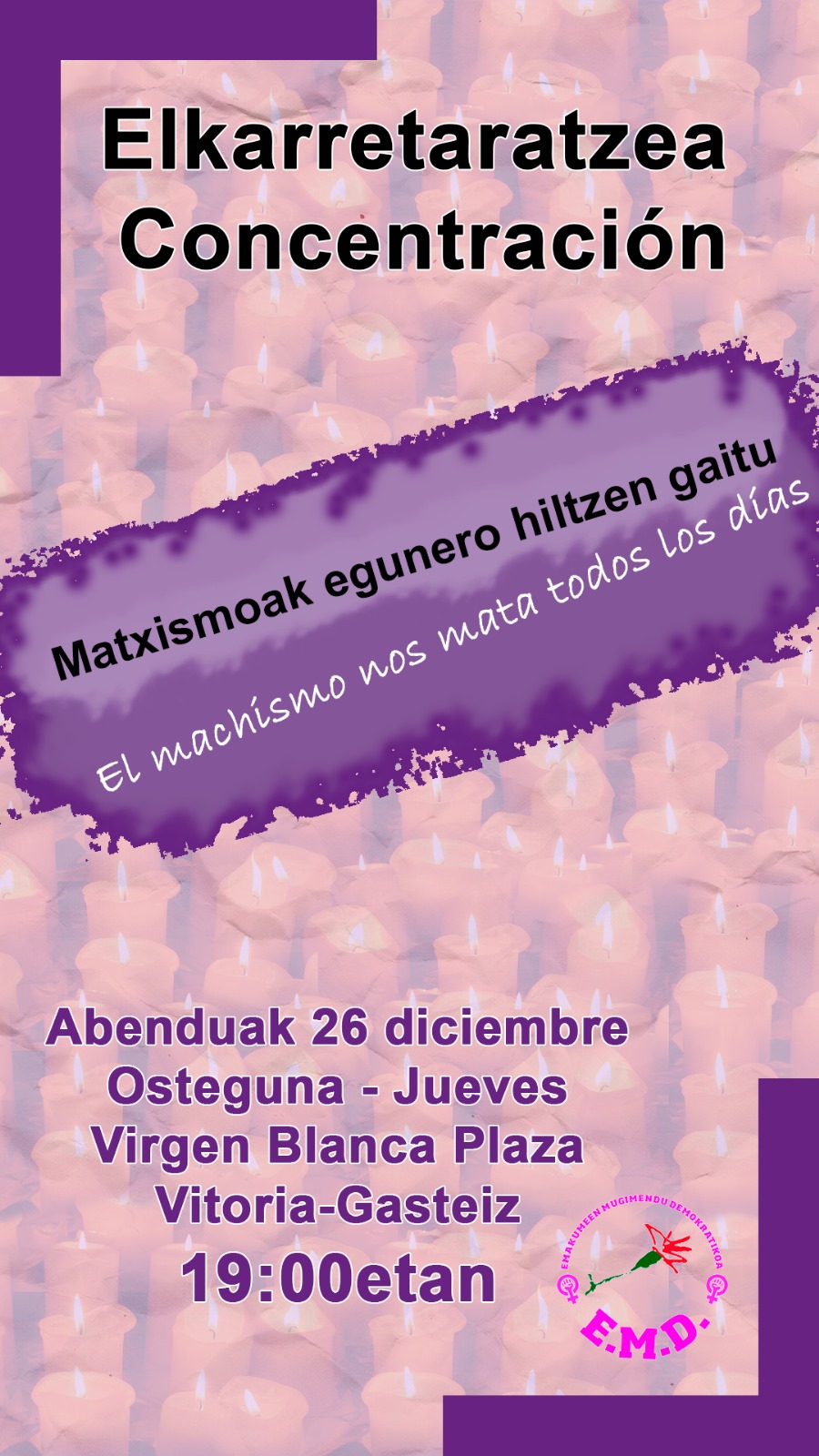 El 26 de diciembre habrá una concentración para denunciar la violencia machista, convocada por el movimiento MDM Euskadi. Será a las 19:00 horas en la Plaza de la Virgen Blanca.