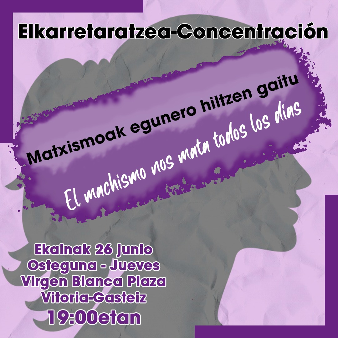 Como cada último jueves de mes, el movimiento feminista MDM Euskadi ha convocado una concentración para denunciar los asesinatos machistas. Será el 26 de junio a las 19:00 horas en la Plaza Virgen Blanca de Vitoria-Gasteiz.