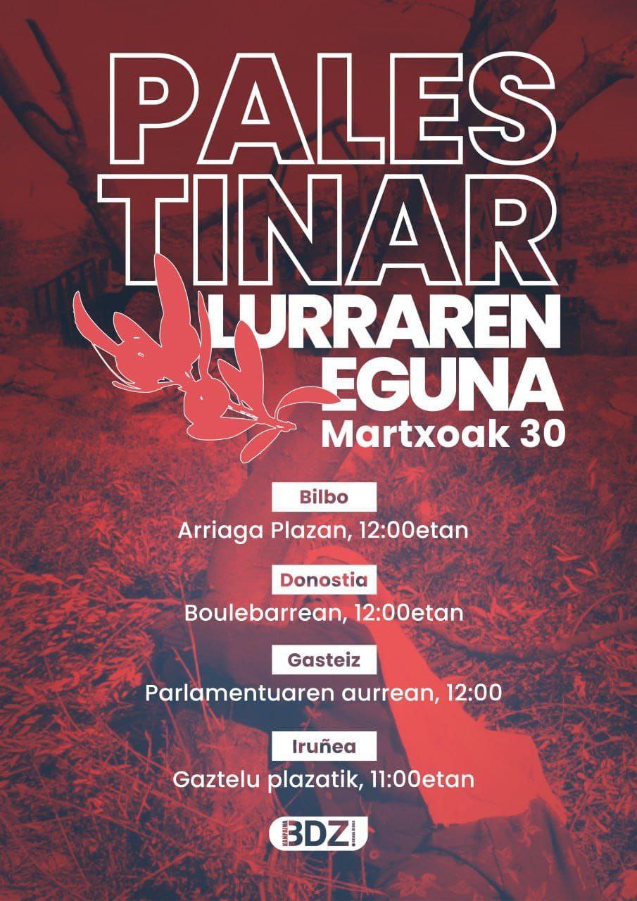 El 30 de marzo se han convocado las siguientes concentraciones con motivo del Día de la Tierra Palestina. Bilbao (Plaza del Arriaga, 12:00 horas); Donostia (Boulevard, 12:00 horas); Vitoria-Gasteiz (Frente al Parlamento Vasco, 12:00 horas).