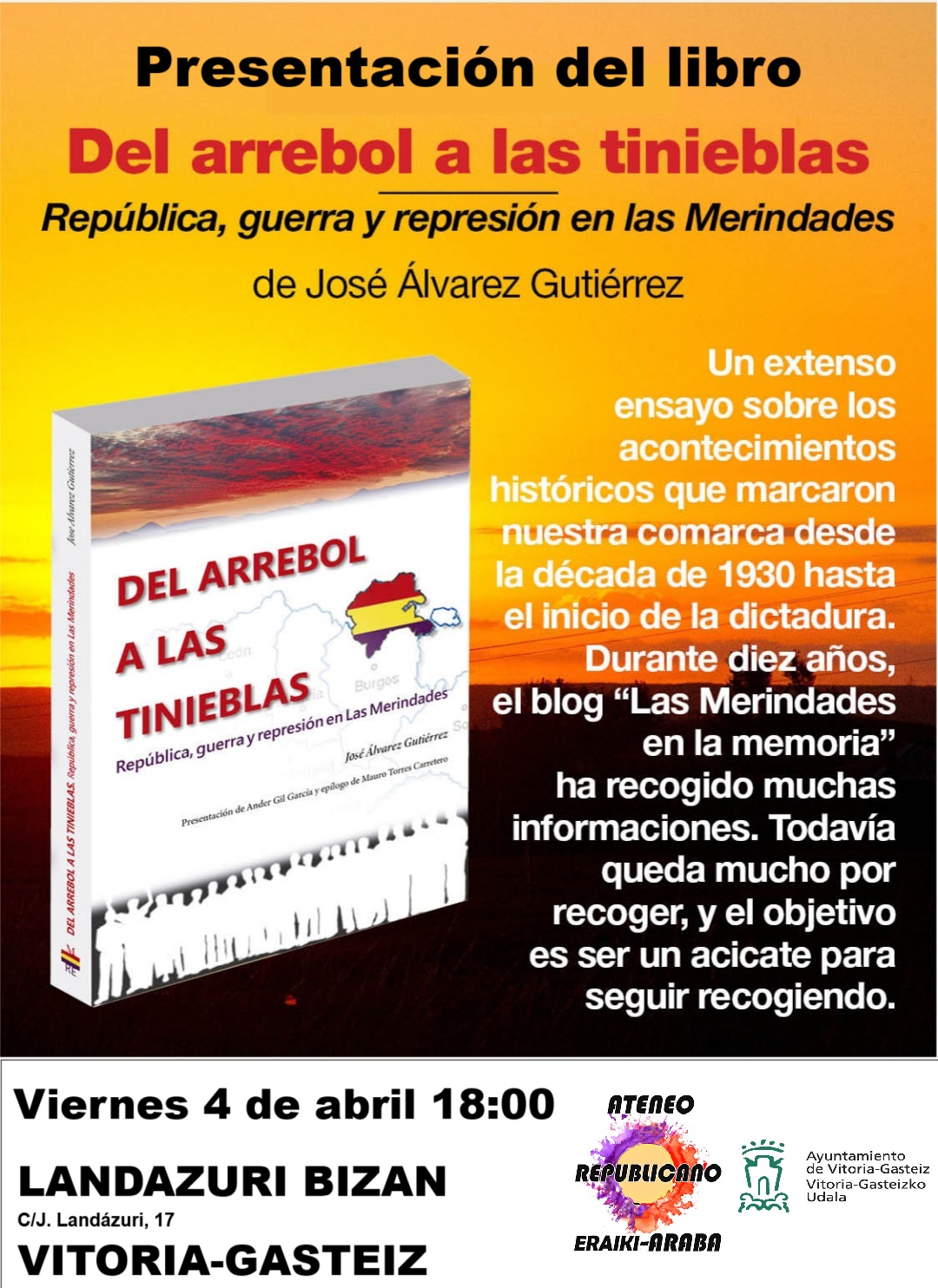El viernes, 4 de abril, a las 18:00 tendrá lugar la presentación del libro ‘Del arrebol a las tinieblas’, de José Álvarez Gutiérrez. El acto tendrá lugar en Landazuri Bizan (calle J.Landazuri, 17, Vitoria Gasteiz. la entrada será libre hasta completar el aforo de la sala.