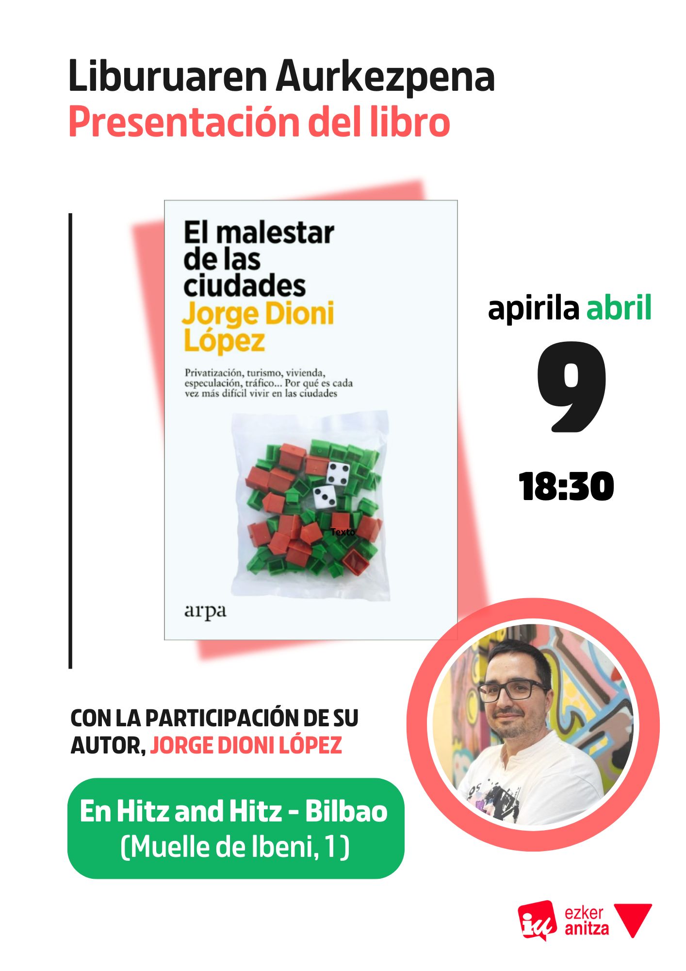 El 9 de abril Bilbao acogerá la presentación del libro ‘El malestar de las ciudades’ en un acto organizado por Ezker Anitza-IU, que contará con la participación de su autor Jorge Dioni López. La presentación tendrá lugar en la sala Hitz and Hitz de Bilbao (Muelle de Ibeni, 1) a partir de las 18:30 horas. La entrada es libre hasta completar aforo.