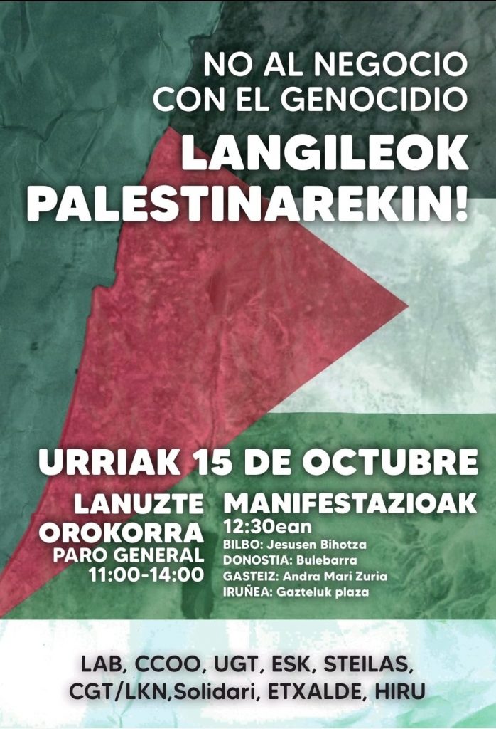 Ezker Anitza-IU anima a las trabajadoras y los trabajadores a participar de forma masiva en el paro general y en las manifestaciones del 15 de octubre para exigir que se rompa “todo tipo de relación con empresas israelíes, así como prohibir eventos deportivos o culturales en los que participen equipos de Israel, como medidas necesarias para denunciar y rechazar el genocidio que el estado sionista está cometiendo en Palestina”.